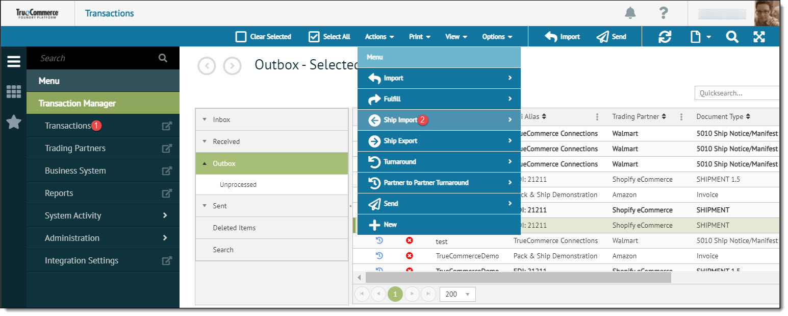 To update the shipping information for the transaction in Transaction Manager, a file must have been previously exported from the shipper. The shipping import will update the existing transactions in the Outbox folder based on the Purchase Order number that is listed in the Alt Document column. The following steps describe how to update transactions in Transaction Manager with the shipping information.